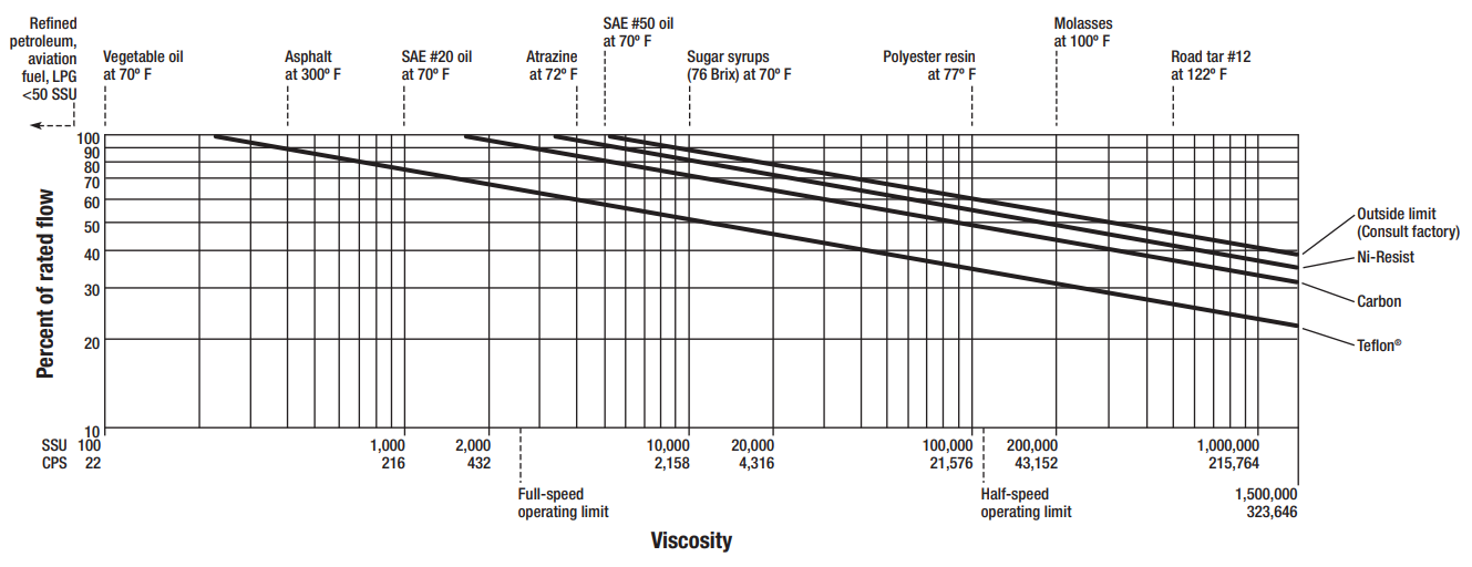 Use the chart below to determine maximum meter flow rate relative to meter bearing material and product viscosity: