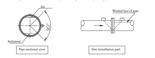 Sensor shall be installed side within 90 degree angle from horizontal. And also, please avoid installation at a joint of flange or welded part of pipe.