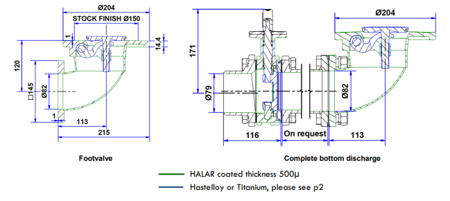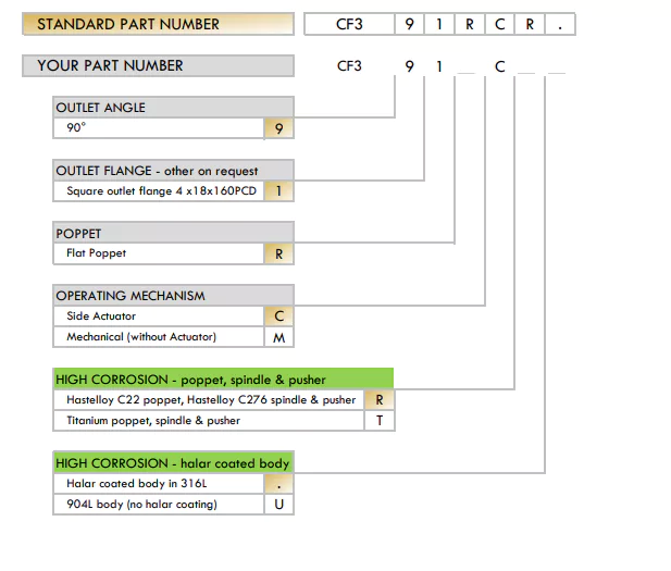 Body: 316/1.4408/CF8M & HALAR coated or 904L without halar coating Poppet, pushrod & spindle: Hastelloy C276 or Titanium |
