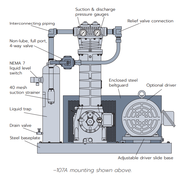 | 107TR Style | Mounting set up to be used as a transport unit. Mounting includes steel baseplate, mechanical liquid trap, non-lube 4-way valve, interconnecting piping, and strainer. Pressure gauges are mounted on the compressor. |