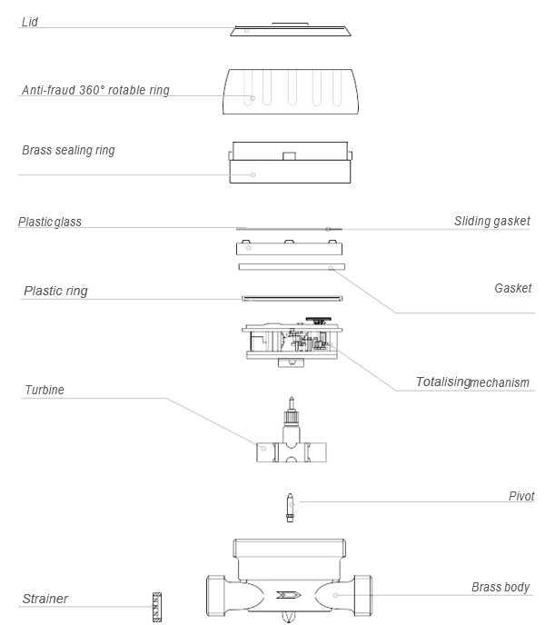 Direct reading with a single jet, wet dial, and a lid that rotates 360 degrees and has an anti-fraud ring.