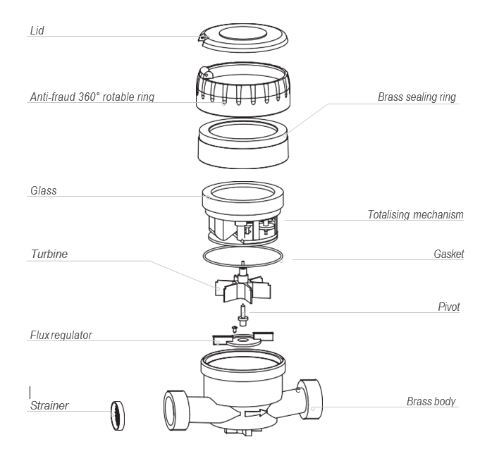 Single jet meter with protected rolls, a semi-dry dial, an anti-fraud ring, and a lid that rotates 360 degrees.